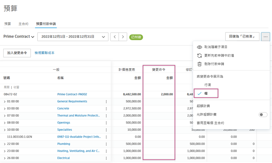 此選項可在「預算付款申請」、「主合約」中,以及「合約計價進度表」、「成本付款申請」和「合約」的詳圖中使用。