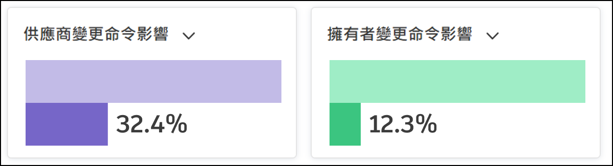 - 供應商變更命令影響:這張卡片包括總計指標,例如傳送後的合約數和執行後的合約數 (預設)。它還會追蹤變更指標,例如傳送後的供應商變更命令和執行後的供應商變更命令 (預設)。