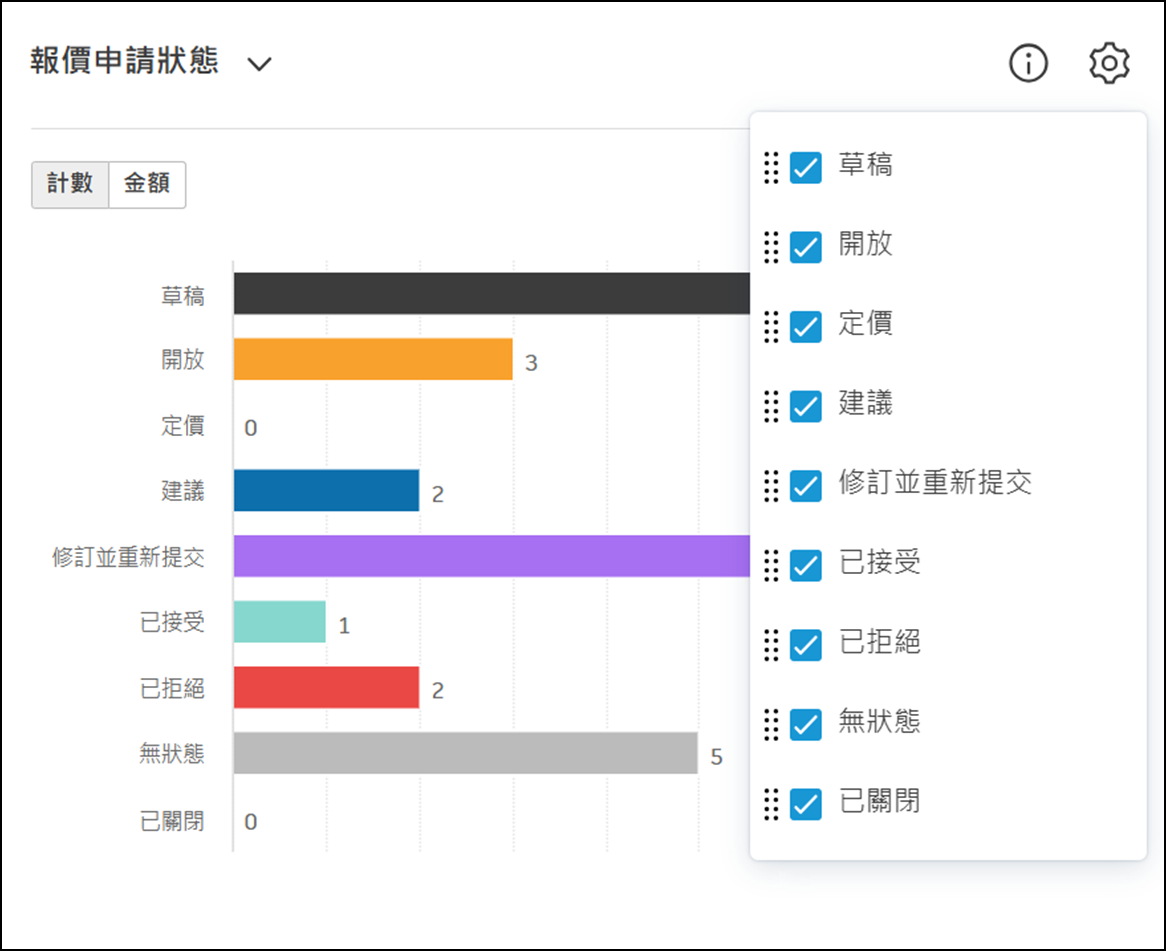 - 計數和金額檢視:在檢視每種狀態關聯的計數與金額之間切換。