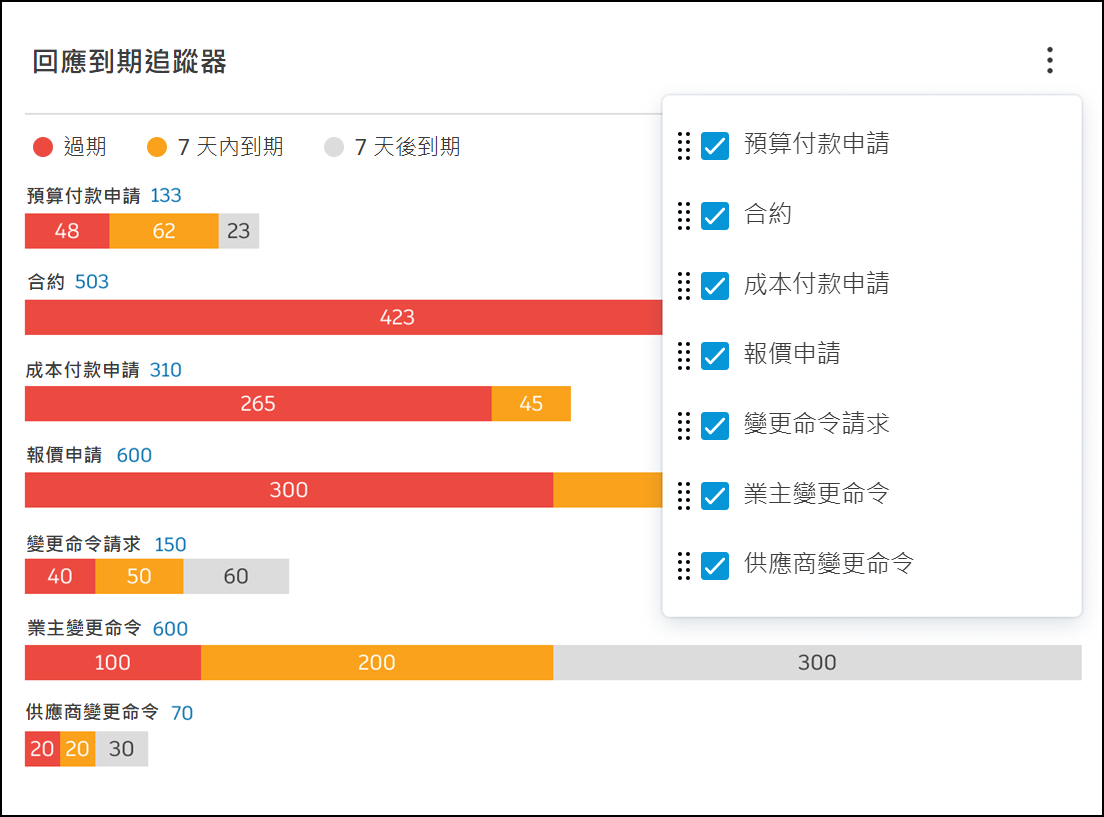 功能表會顯示所有項目具有「回應到期」屬性的頁籤。成員可以選取或取消選取功能表項目,以切換其對應橫形圖的顯示。