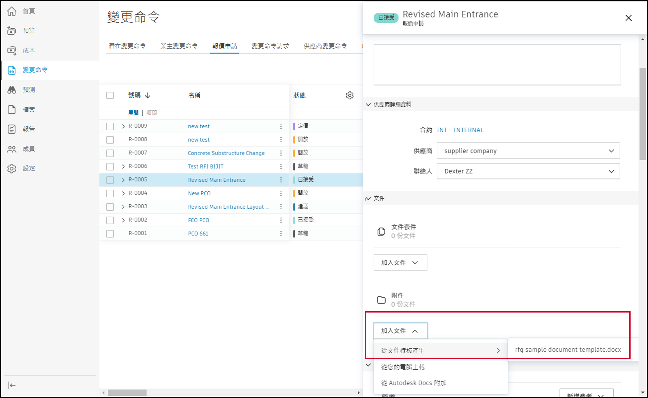 - 從報價請求加入:適用於變更命令請求 (COR) 及供應商變更命令 (SCO)。需要包含報價請求文件時,請使用此選項。