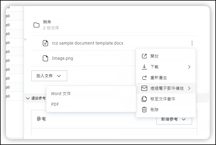 管理員可以將文件加入為附件。這些文件可以從樣板產生。