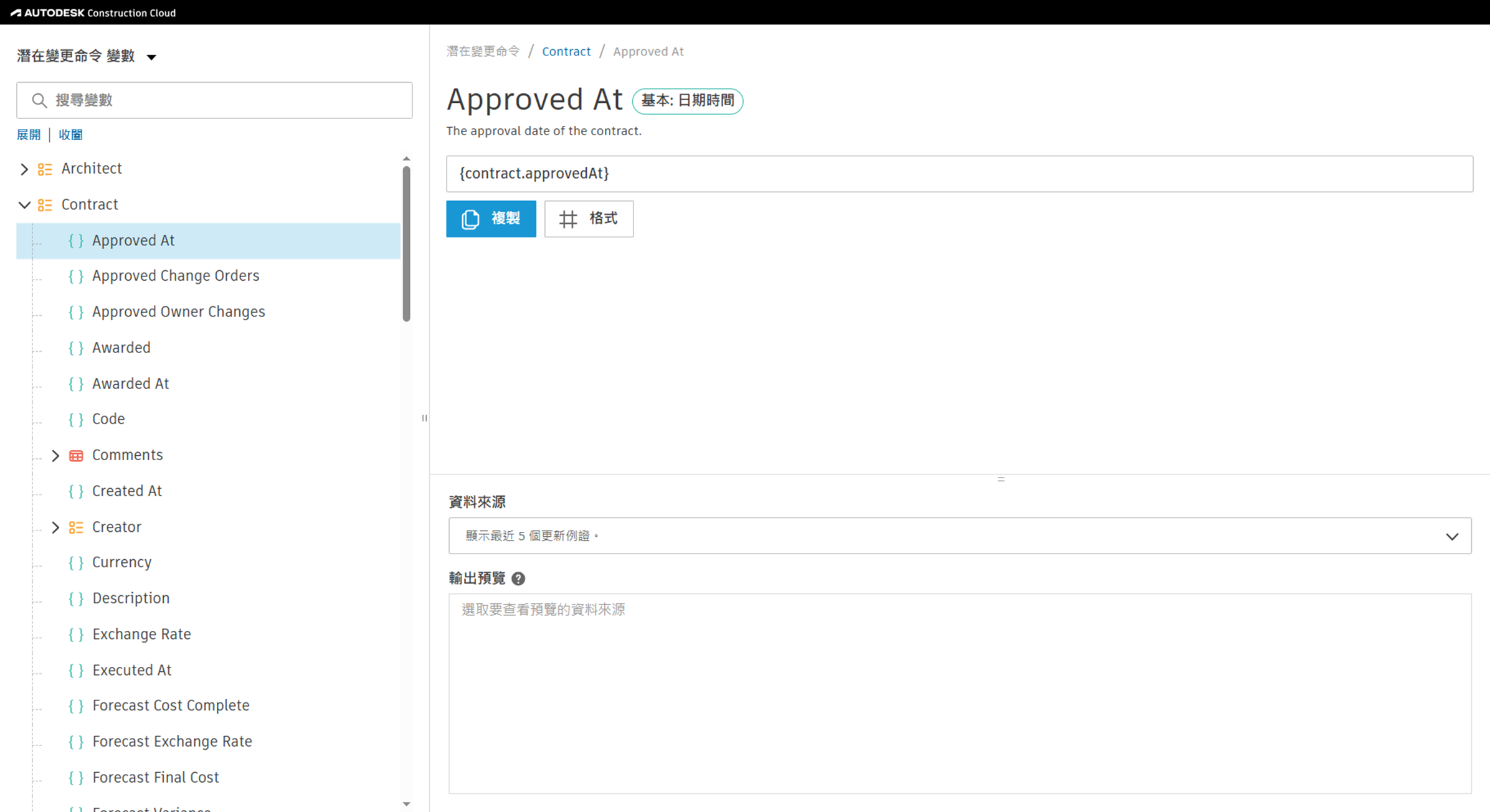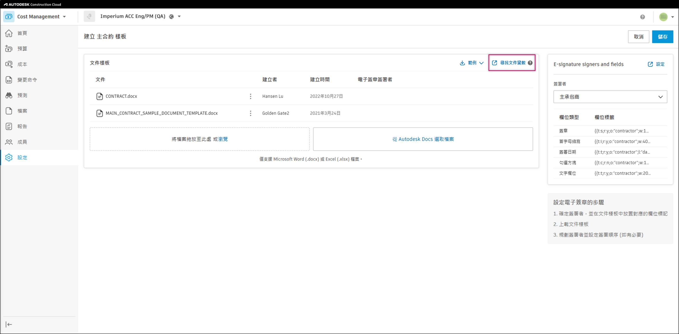 文件樣板會使用變數從「成本管理」中提取資料。專案管理員可以定義文件樣板,並使用這些變數在產生文件時自動提取資料。這讓您不需手動為文件中的表單和欄位輸入資料。