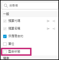 透過將「整合狀態」欄加入至「預算」、「成本」和「變更命令」工具的表格視圖,您將可以看到已鎖住和已整合的項目、區段和動作。
