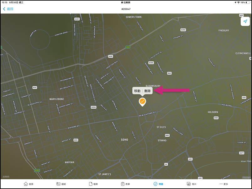 i.移動:按住問題地圖不放,並拖曳至新位置。點選以放置圖釘。