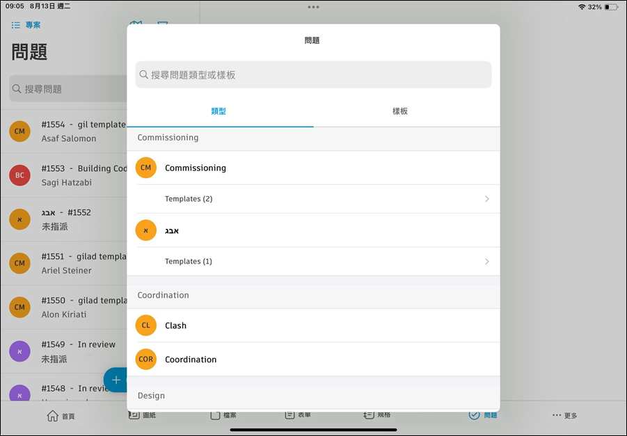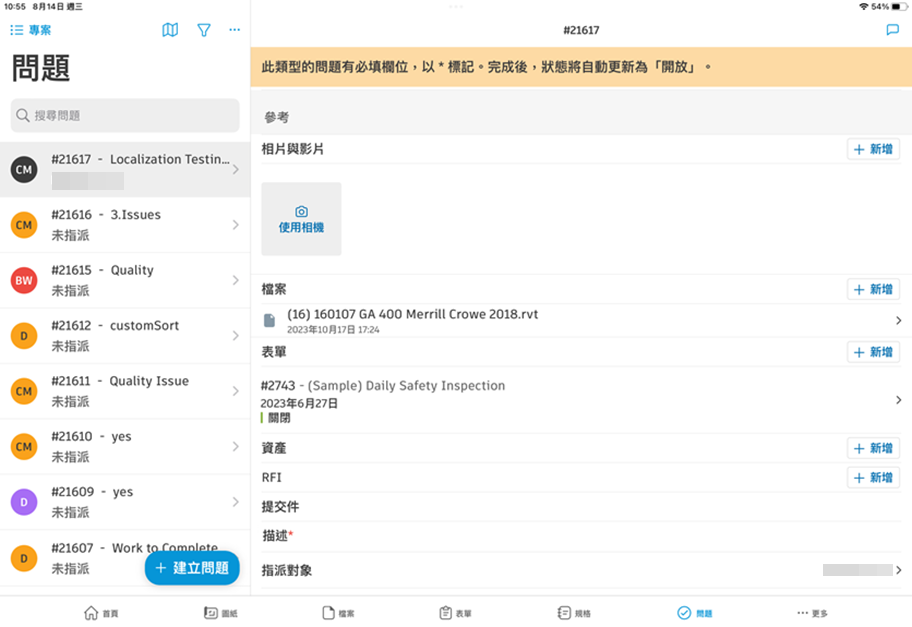 在 Autodesk Construction Cloud 行動應用程式的「問題」工具中,點選