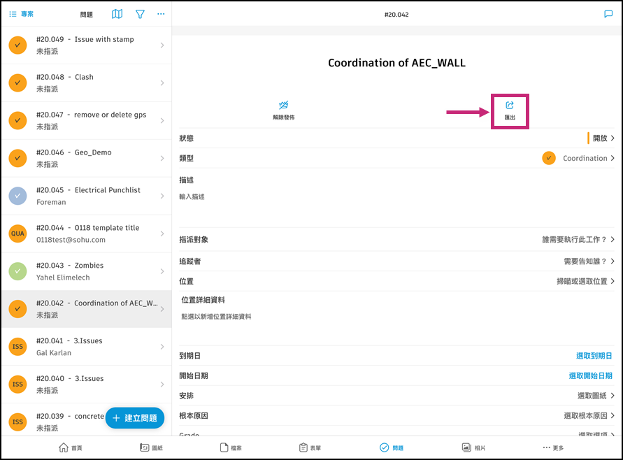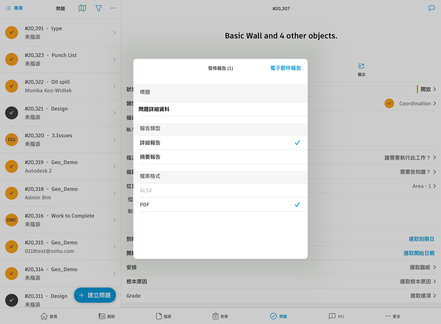 在 Autodesk Construction Cloud 行動應用程式的「問題」工具中,您可以產生「問題」報告,並以電子郵件寄給您自己。