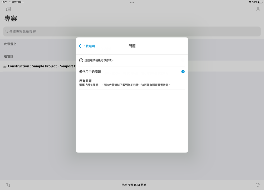依預設,當您在 iOS 裝置下載專案時,只會下載作用中問題。