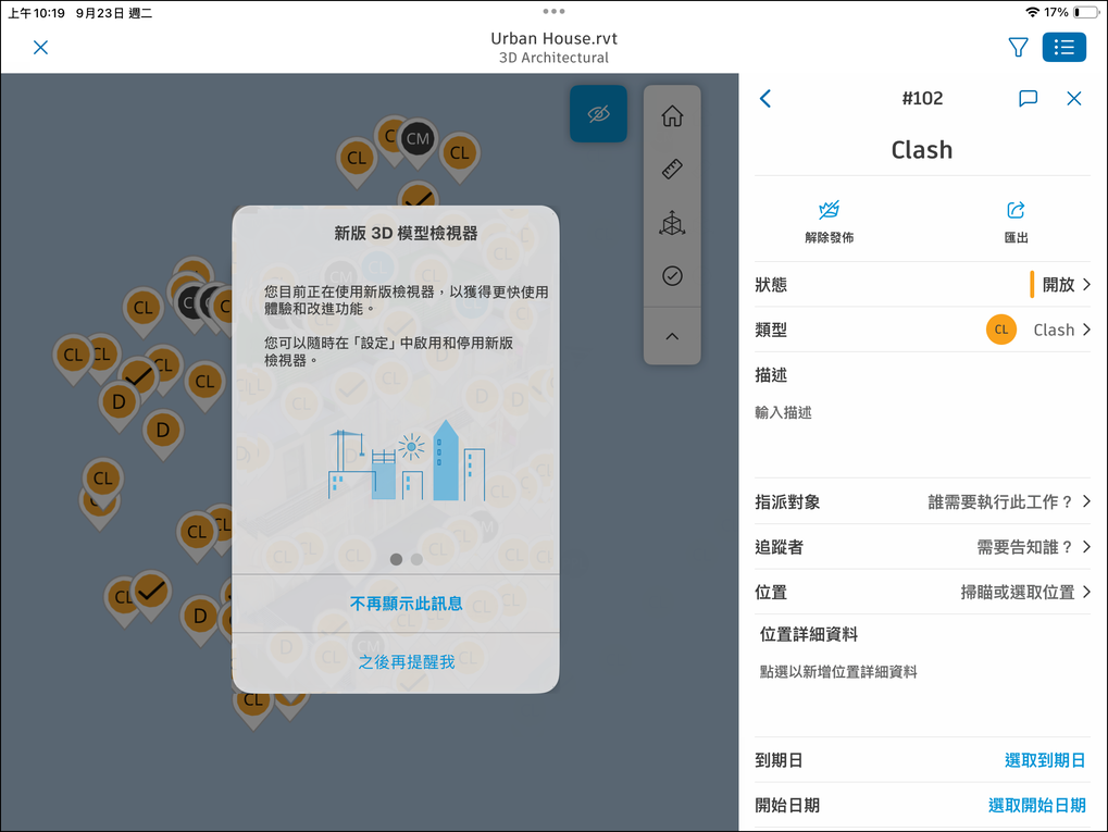 您可以在新檢視器中檢視放置在 3D 模型上的問題。