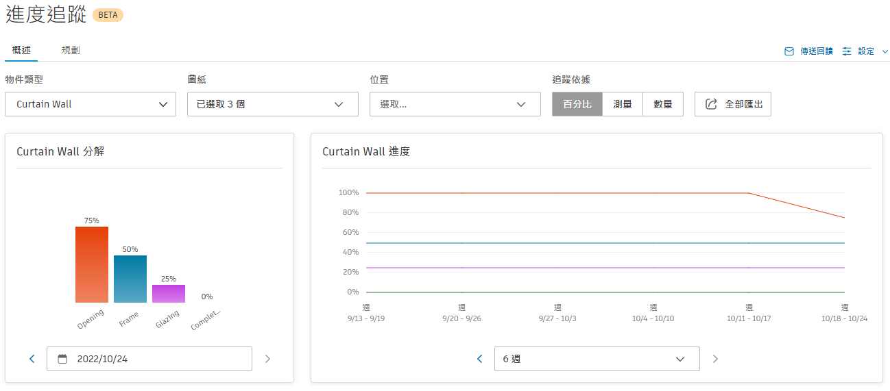 您可以依完成百分比、測量或物件計數來追蹤安裝進度。這可讓您動態調整進度表,並為負責專案的每個人提供精確的進度更新。
