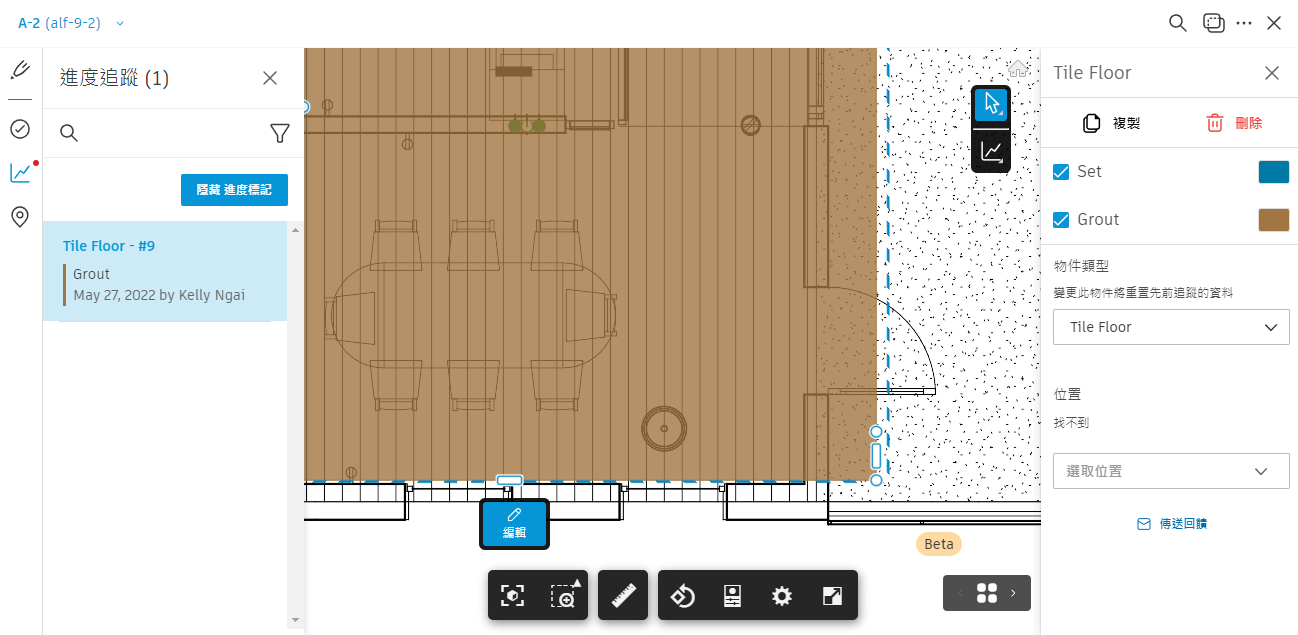 若要使用「進度追蹤」,您首先要在「進度追蹤」工具中規劃物件類型。規劃後,您可以使用「圖紙」工具中的標記功能來追蹤物件。