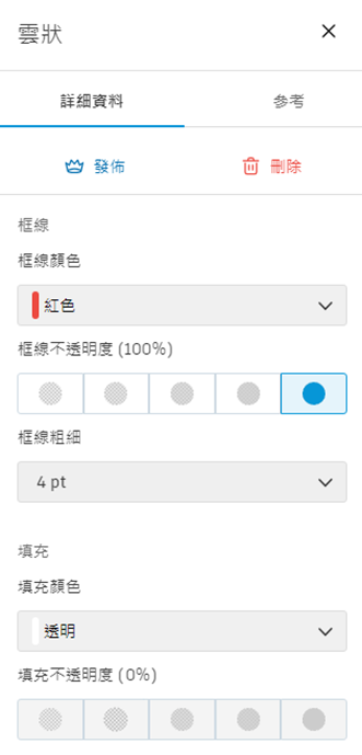 您可以選取邊界顏色以套用至所有標準標記,也可以直接從標記工具列將顏色填滿至造型、文字方塊和圖說。您所做的選取將會保留,以便您從現在開始建立的任何標記都將遵循這些顏色。