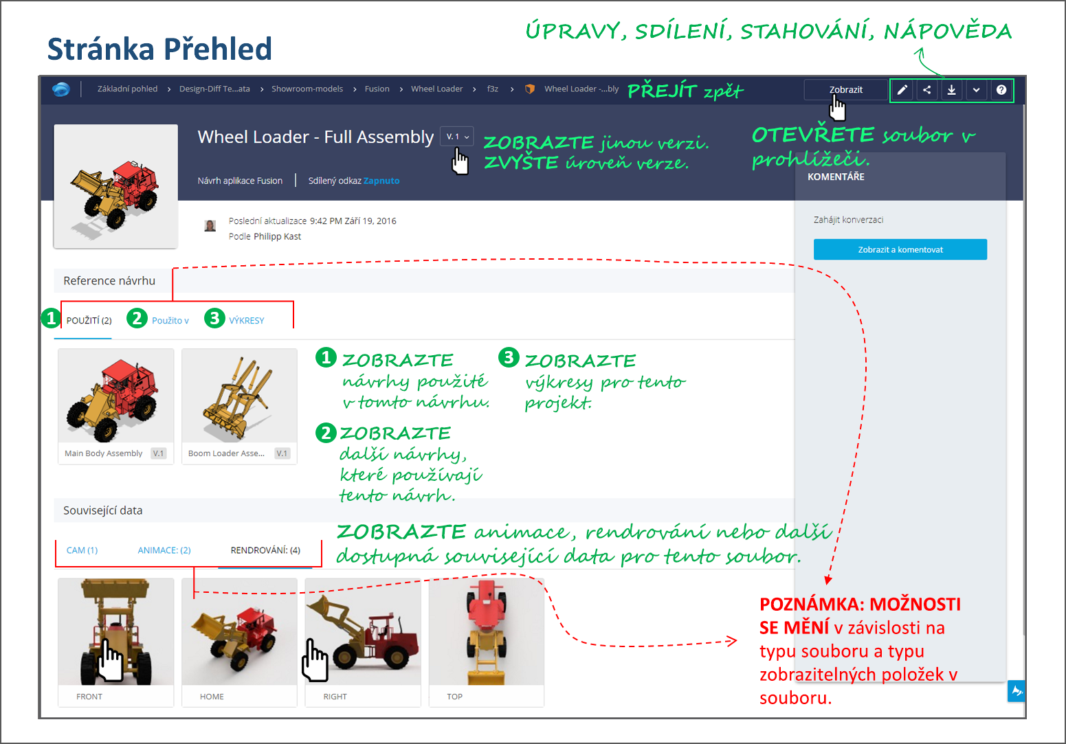 Chcete-li zobrazit podrobnosti o souboru, klikněte na tlačítko Zobrazit přehled v prohlížeči služby A360. Níže uvedený obrázek vás navede k rozvržení stránky Přehled. Zelený text ukazuje akce, které lze na stránce provádět.