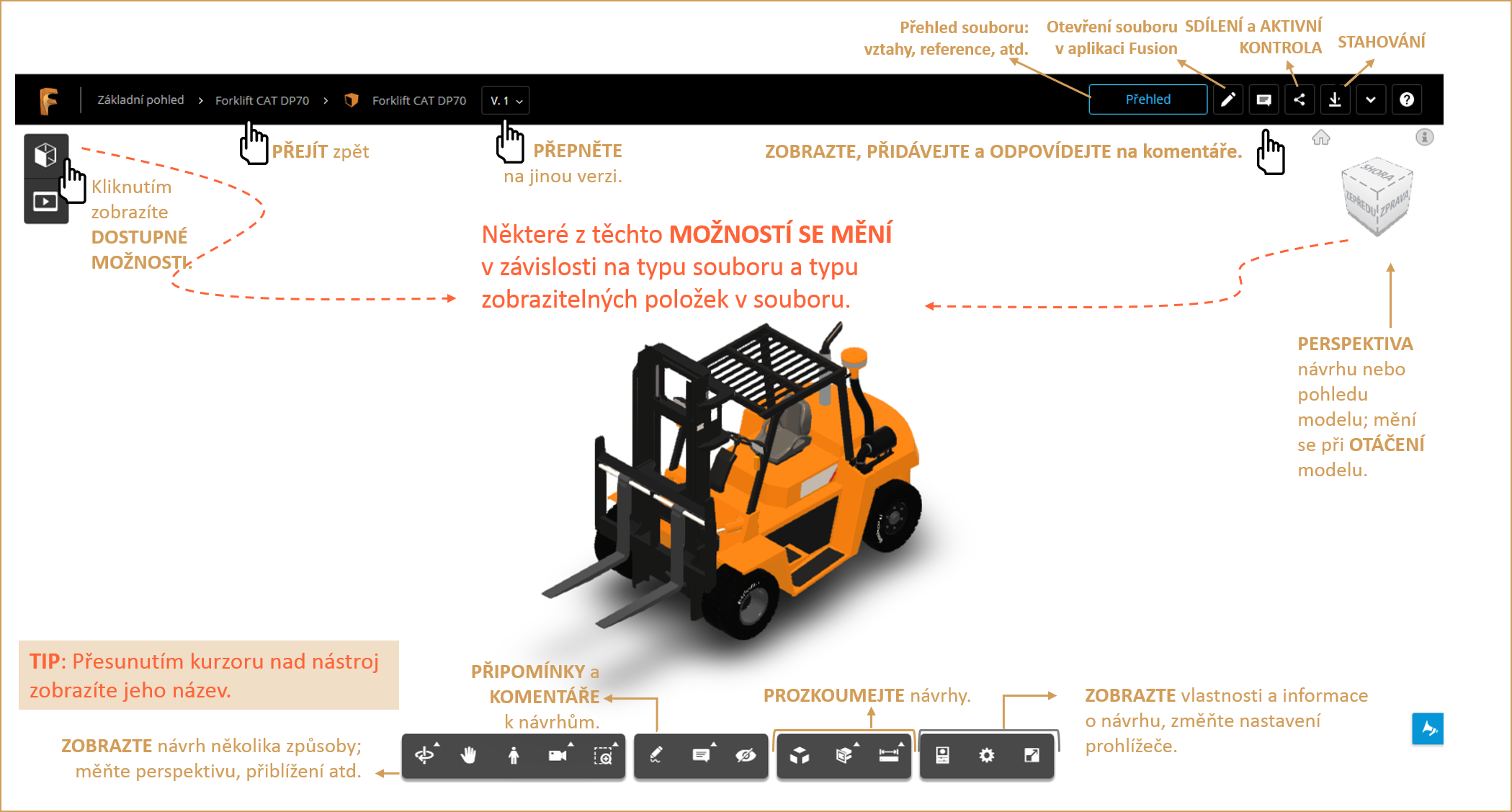 Soubor návrhu otevřete v prohlížeči kliknutím na soubor ve složce nebo kliknutím na možnost Zobrazit na stránce Přehled. Soubory aplikace Fusion se ve výchozím nastavení otevřou na stránce Přehled. Snímek níže zobrazuje hlavní oblasti prohlížeče a možnosti a nástroje, které jsou v prohlížeči k dispozici.