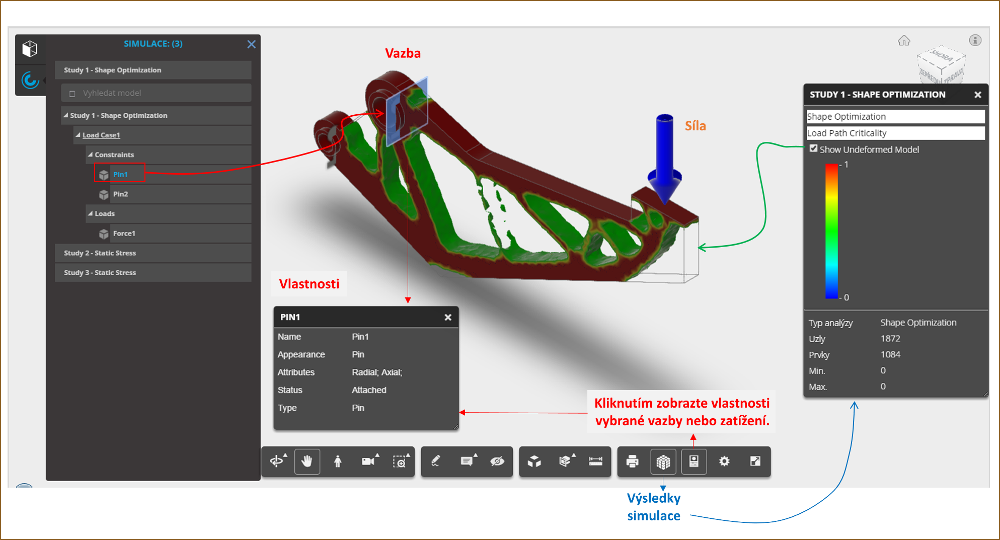 - Rozbalením studie zobrazte vazby a zatížení, které byly použity ve studii.