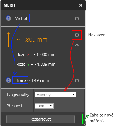 Chcete-li měřit novou součást, zrušte předchozí výběr kliknutím kamkoli jinam uvnitř prohlížeče nebo klikněte na možnost Restartovat. Dostupné jsou následující měrné jednotky: