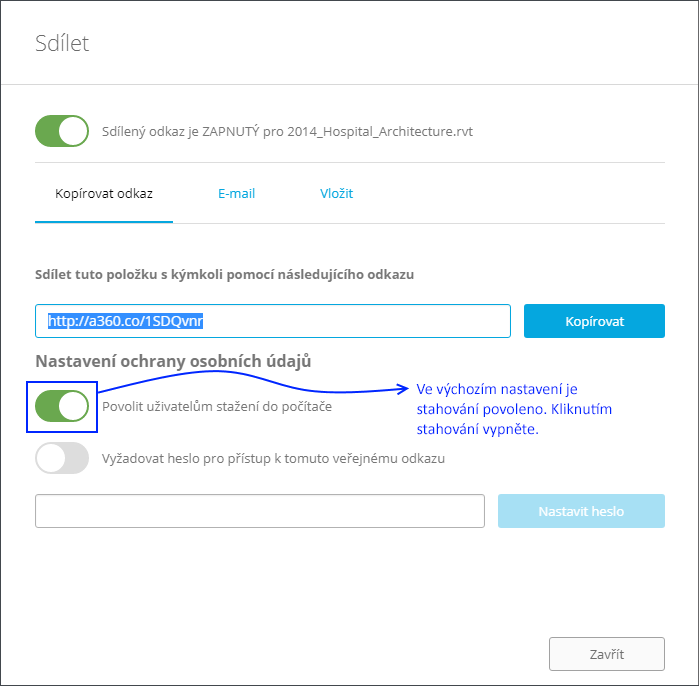 Ve výchozím nastavení je pro sdílené odkazy zapnuta možnost Stáhnout. Tuto možnost můžete vypnout. Kromě toho můžete pro soubor nastavit heslo.