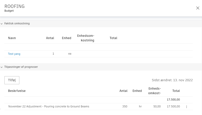 Ændringerne i prognosen kan ses på flere budgetrelaterede steder. I afsnittet Ændringer af prognose i panelet Detaljer i budgettet kan du f.eks.: