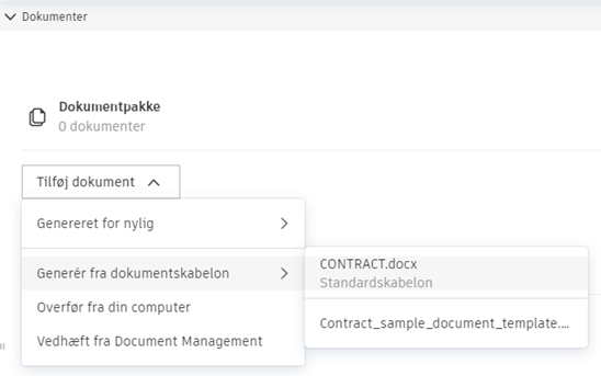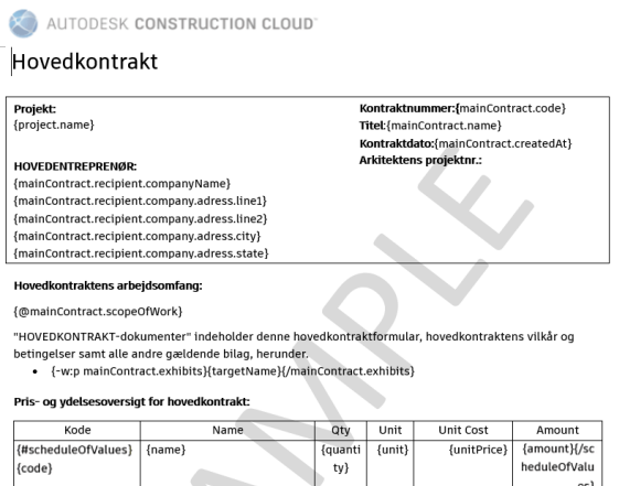 Før du kan generere dokumentskabeloner, skal en projektadministrator oprette de respektive dokumentskabeloner i Project Admin. Skabeloner oprettes ved hjælp af felter, der automatisk udfyldes med data fra systemet, når de genereres.