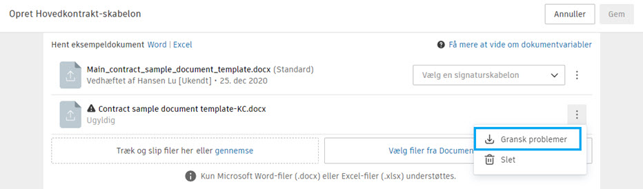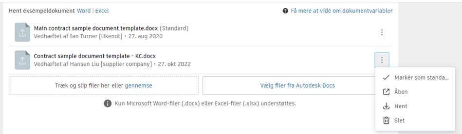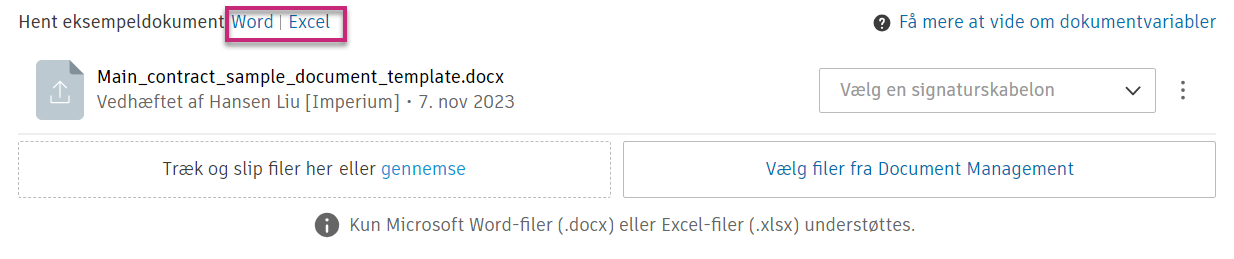 Under processen med at oprette dokumentskabeloner kan du hente og redigere et eksempel på en dokumentskabelon. Det gør du ved at vælge Word eller Excel for at hente en Word- eller Excel-fil, der kan tilpasses.