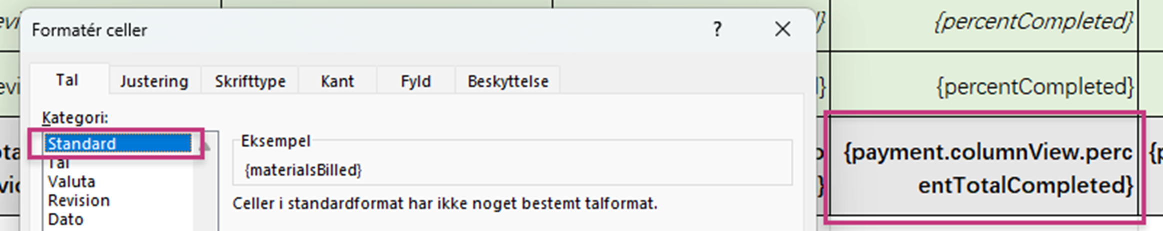 Hvis du vil angive en procentværdi i kolonnen med procent i Excel-skabeloner, skal du formatere cellerne som Generelt. Under import til Cost Management fortolker skabelonen automatisk værdien som en procentdel (brug f.eks. 12.39 til 12.39%).