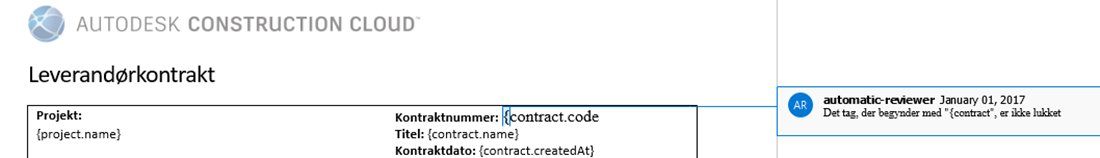Dokumentskabelonen starter download. Åbn den downloadede dokumentskabelon. Du kan se kommentarerne ud for ugyldige variabler.