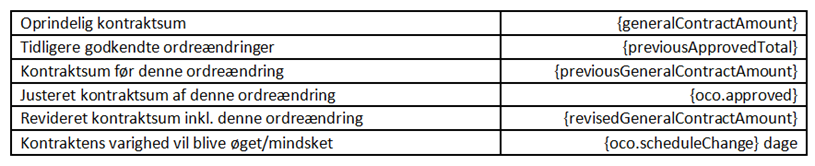 | {revisedGeneralContractAmount} | [D], hvor [D] = [C] + sum af godkendte omkostningselementværdier under denne RCO, herunder opskrivninger | ![]() |