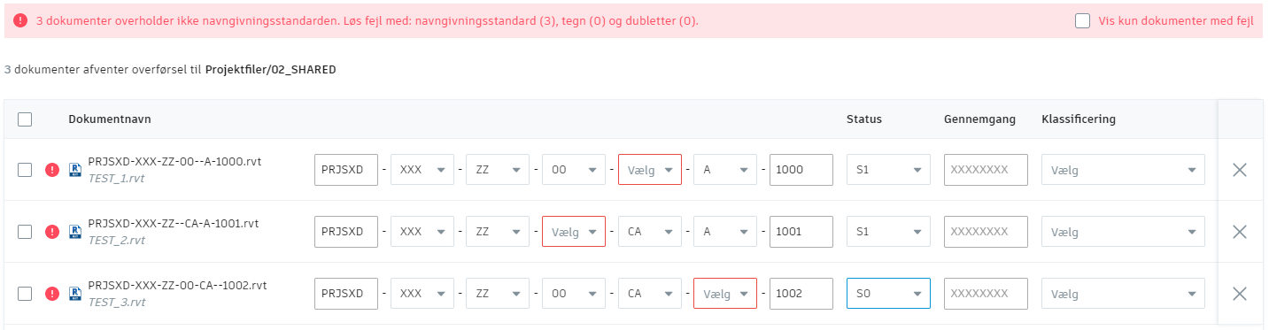Opbevaringsområdet gemmer dokumenter, der indeholder dokumentnavne, som ikke opfylder kravene. Det er nyttigt, når et projektmedlem overfører dokumenter, som ikke overholder navngivningsstandarden. Hvis opbevaringsområdet er aktiveret, kan overførslen fortsætte, og dokumentnavnene kan opdateres på et senere tidspunkt, så fejlene ved dokumentnavnene rettes.