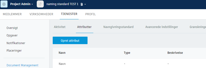 Ud over at tilføje attributter direkte fra modulet Document Management kan du nu oprette og administrere attributter fra fanen Attributter i indstillingerne for Document Management i modulet Project Admin.