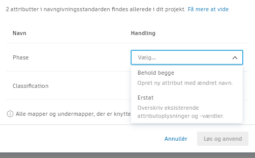 Hvis dit projekt allerede indeholder attributter med samme navn som dem i den importerede navngivningsstandard, kan du løse problemet med dubletter med følgende muligheder.