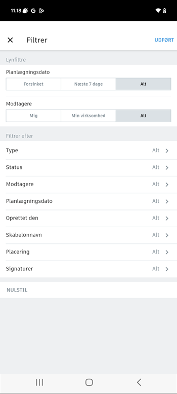 Filtre: Du kan filtrere efter type, skabeloner, status, placering eller underplacering, modtager, tidsplansdato, signatur eller oprettelsesdato. Tryk på Filtre