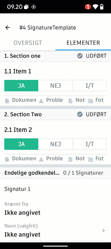 Du skal muligvis sende din signatur for at udføre en tjekliste. Gå til sektionen Signatur/Endelige godkendelser, tryk på feltet Tryk for at signere, og tegn din signatur. Aflever om nødvendigt enheden til den person, hvis signatur er påkrævet.
