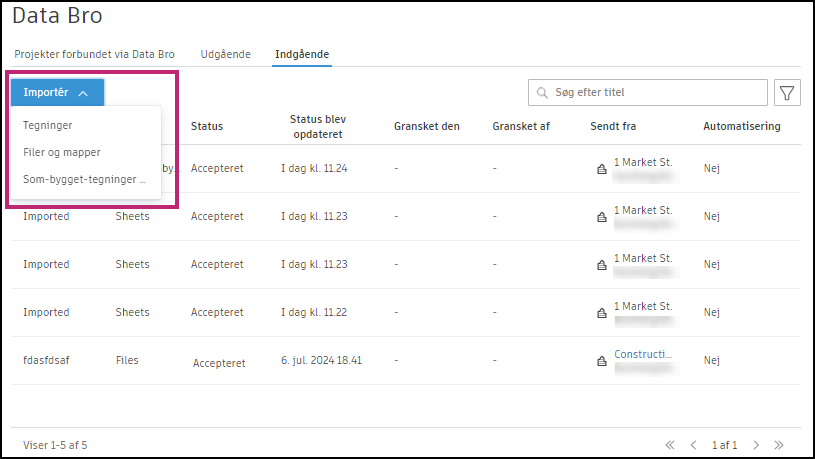 Som-bygget-tegningen fra PlanGrid vises i filværktøjet i den valgte målmappe. Projektadministratorer får en e-mailmeddelelse, når som-bygget-tegningerne er klar. Der vises en post for denne import under fanen Indgående.