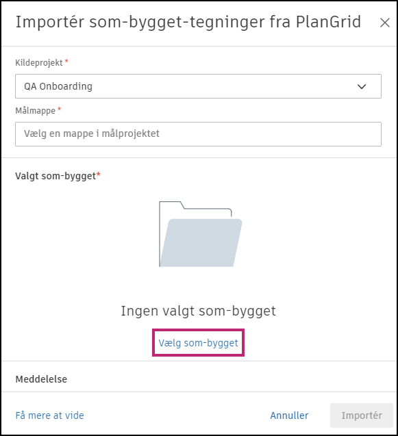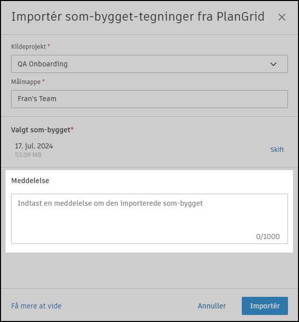 (Valgfrit) Du kan indtaste en meddelelse om den importerede som-bygget-tegning, der giver kontekst til dine projektmedlemmer.
