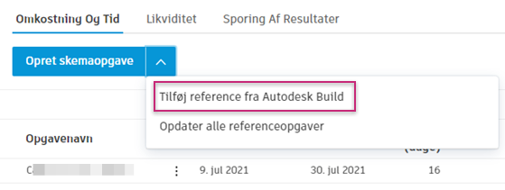 På den første fane Omkostning og tid skal du vælge pilen ved siden af knappen Opret tidsplansarbejdsopgave og derefter vælge Tilføj reference fra Autodesk Build.