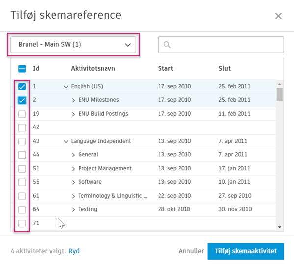 Dialogboksen Tilføj tidsplansreference vises. Brug rullemenuen til at vælge den ønskede tidsplan.