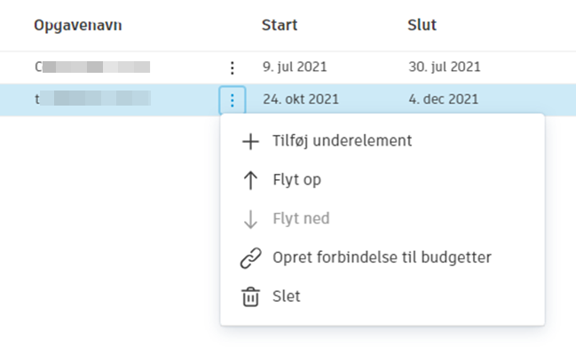 Når tidsplansarbejdsopgaver og budgetelementer er blevet kædet sammen, udfyldes start- og slutdatoerne automatisk. Du kan vælge at ændre start- eller slutdatoen for budgettet og datoerne for de sammenkædede planlægningsarbejdsopgaver. Klik på kolonnen Start eller Slut ved siden af den pågældende arbejdsopgave eller det pågældende budgetelement.