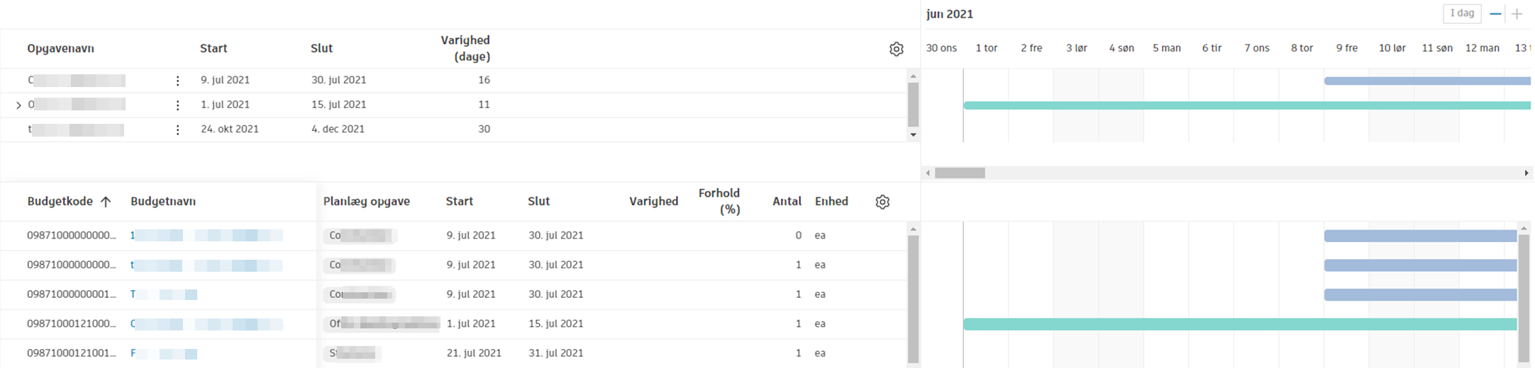 Når elementerne er blevet kædet sammen, vil stregfarven for arbejdsopgaven og budgetelementet være den samme. Start- og slutdatoer sammenkædes også automatisk. Du kan ændre datoerne manuelt.