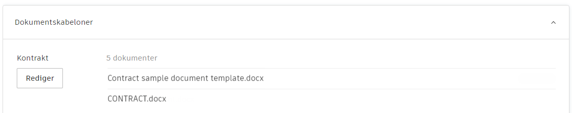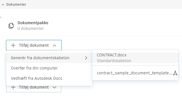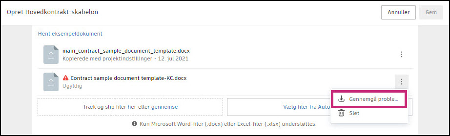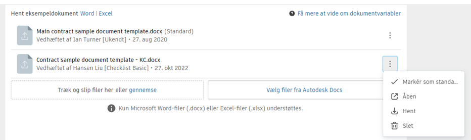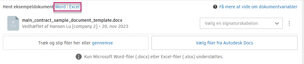 Under processen med at oprette dokumentskabeloner kan du hente og redigere et eksempel på en dokumentskabelon. Det gør du ved at vælge Word eller Excel for at hente en Word- eller Excel-fil, der kan tilpasses.