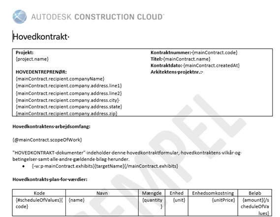 Den hentede skabelon kan tilpasses, så den passer til virksomhedens behov. Indholdet i parenteserne skal dog bevares, for at modulet kan genkende og automatisk udfylde det, når dokumentet genereres. Få mere at vide om variabler.