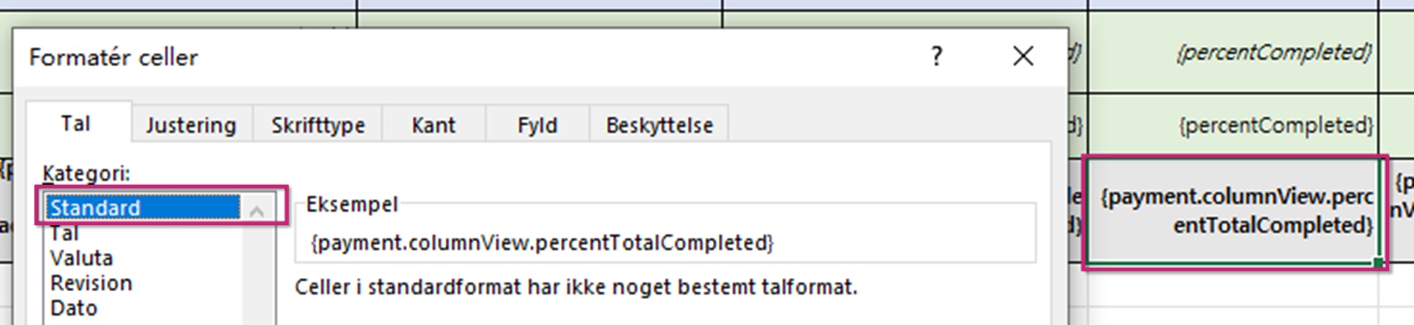 Hvis du vil angive en procentværdi i kolonnen med procent i Excel-skabeloner, skal du formatere cellerne som Generelt. Under import til Cost Management fortolker skabelonen automatisk værdien som en procentdel (brug f.eks. 12.39 til 12.39%).