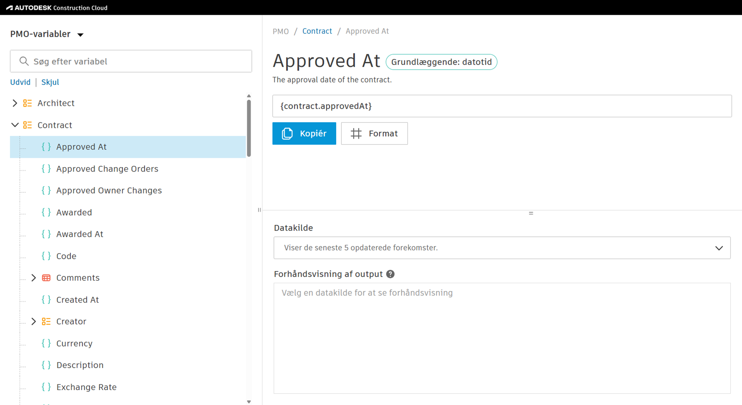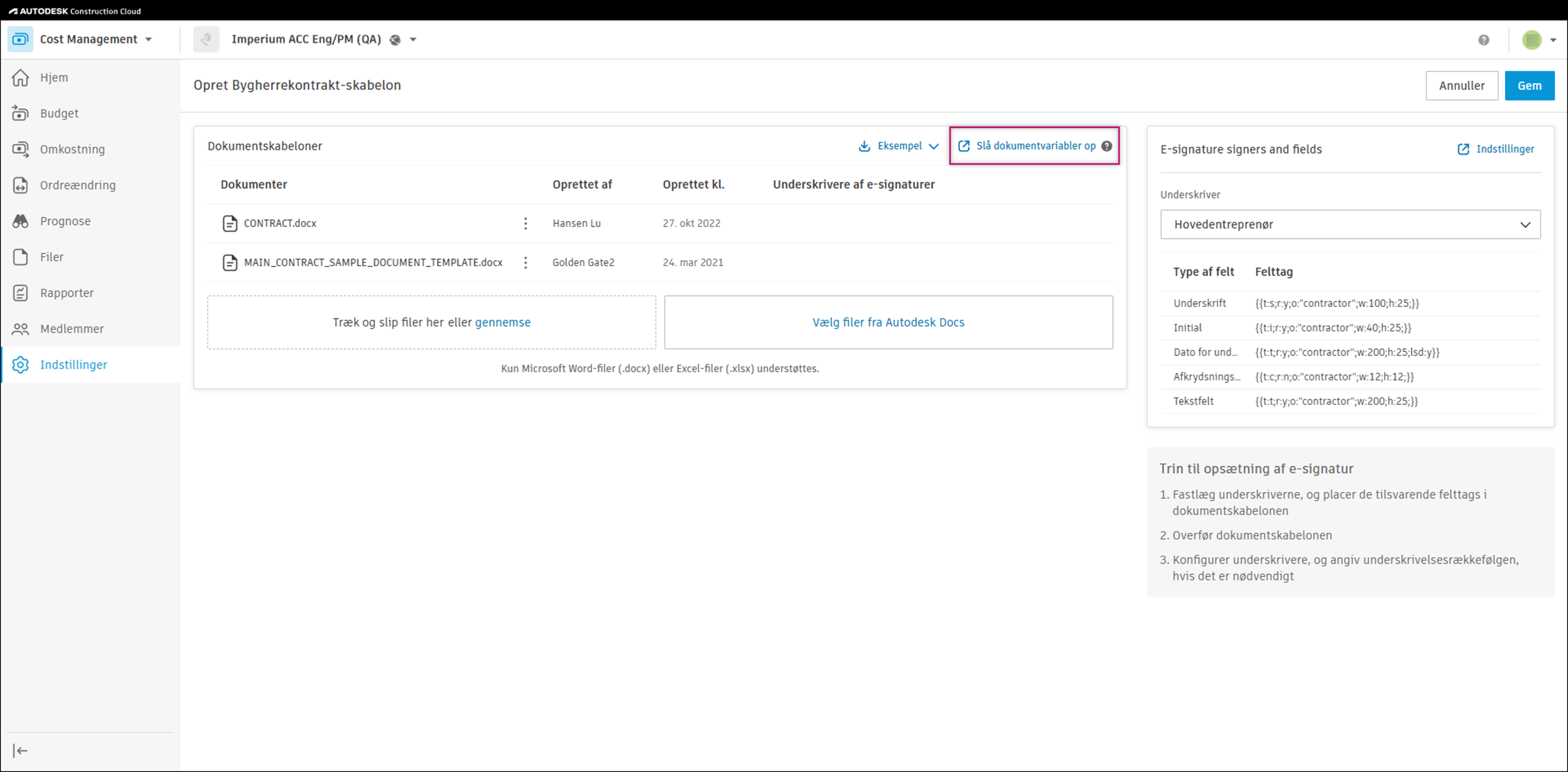 Dokumentskabeloner bruger variabler til at trække data ind fra Cost Management. Projektadministratorer definerer dokumentskabelonerne og kan anvende disse variabler til automatisk at trække data ind, når dokumentet genereres. Det bidrager til at undgå manuel dataindtastning i formularer og felter i dokumenter.