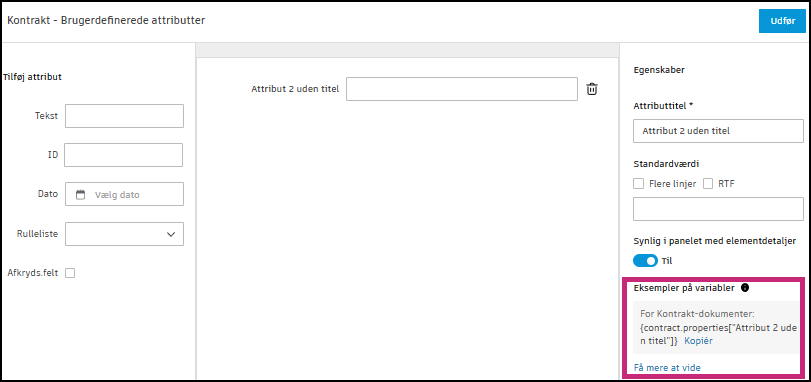 Formatet for disse brugerdefinerede attributter er {xxx.properties["Attributtitel"]}.
