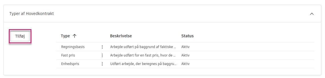 Hvis du vil tilføje en bygherrekontrakttype, skal du klikke på Tilføj øverst til venstre i Bygherrekontrakttyper.