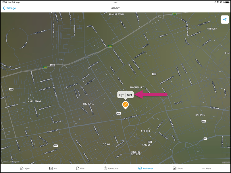 b. Hvis du ikke tillader, at appen bruger din placering, bliver du bedt om at placere en opgavetegnestift på kortet. Det kort, der vises, er baseret på dit projekts placering. Flyt kortet til den ønskede placering, og tryk på kortet for at placere opgaven.