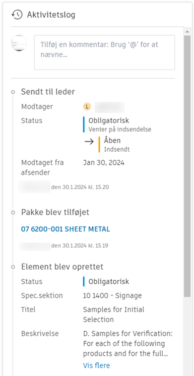Viser en oversigt over alle aktiviteter, der er relateret til indsendelseselementet.