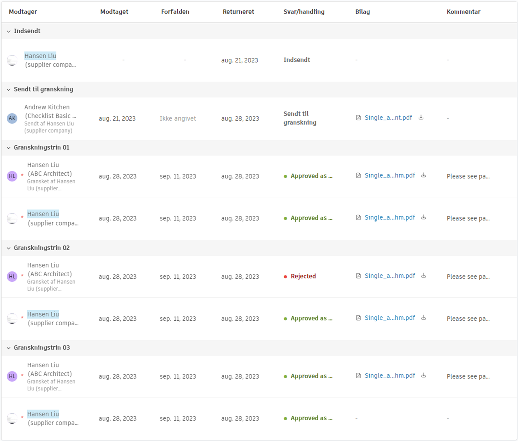 I arbejdsgangstabellen viser rollenavne de faktiske brugere, der udførte granskninger: