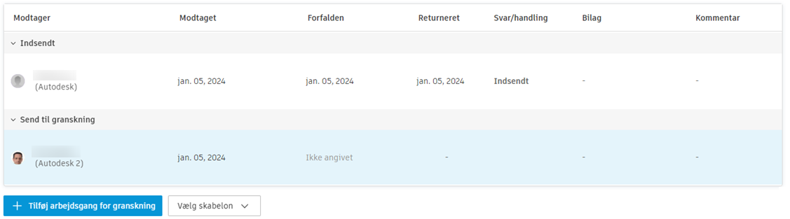 Hvis du holder markøren over "Afventer granskning fra", vises de brugere, der endnu ikke har svaret, og hvis du holder markøren over "Har svaret", vises de granskere, der allerede har fuldført deres granskning.