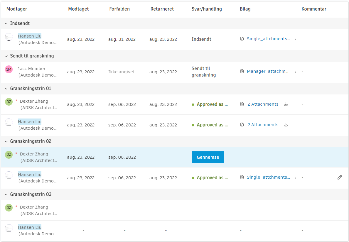 Fuldførte granskninger: Tidligere indsendte svar er synlige med tidsstempler og granskeroplysninger