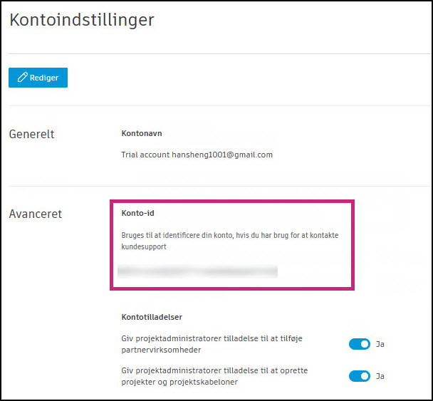 I forbindelse med supportrelaterede formål eller i forbindelse med tilslutning af brugerdefinerede integrationer (kun erhvervskonti), skal du have et unikt Autodesk Construction Cloud-konto-id. Sådan gør du: